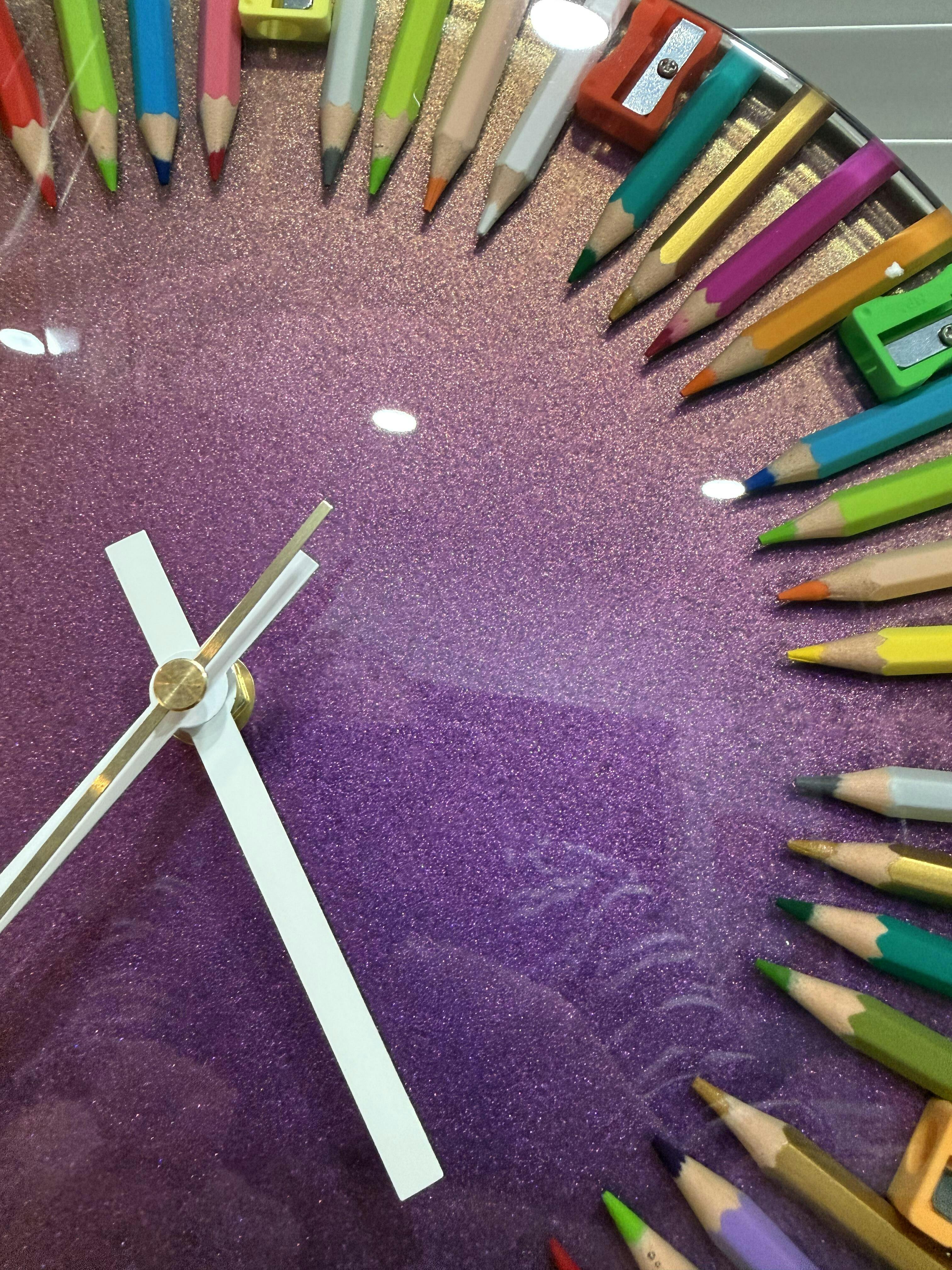 Chroma Balance is a wall clock where intensity is intentionally refined into a calm, circular composition. Real coloured pencils and pencil sharpeners create rhythm and structure, while the chameleon pigment shifts tones depending on light and viewing angle.